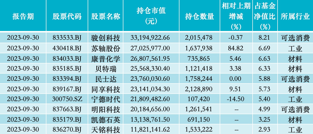在三季度陈述中,该基金的前十大重仓股永别为骏创科技(833533.BJ)、苏轴股份(430418.BJ)、康普化学(834033.BJ)、贝特瑞(835185.BJ)、民士达(833394.BJ)、同享科技(839167.BJ)、宁德时间(300750.SZ)、明阳科技(837663.BJ)、凯德石英(835179.BJ)、天铭科技(836270.BJ)。